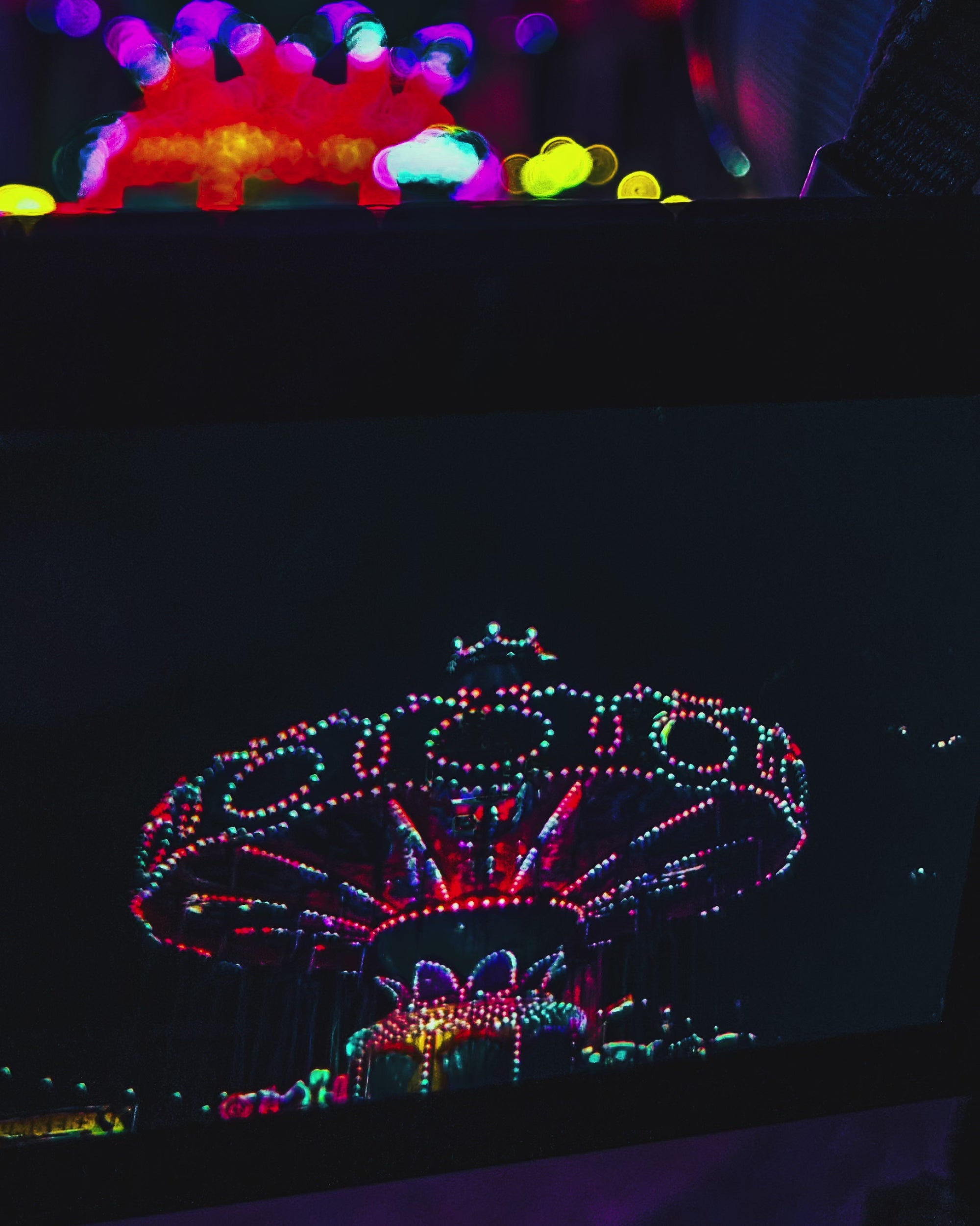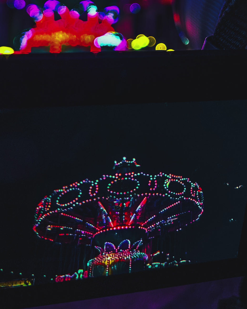 I had spent quite some time capturing photos of this carousel and waiting for it restart every time it stopped was tedious yet the lights and fast moving pace of the carousel revitalised my energy levels each time. Before packing my tripod away for the night I figured to capture a video recording of the my camera set up in front of the carousel. During the video recording I was intrigued as the carousel appeared twice on my phone screen but in 2 different versions.
